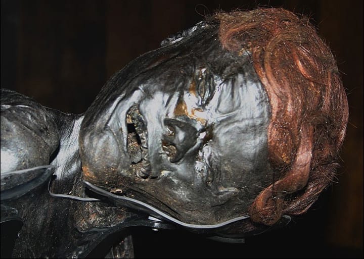 Notice how well-preserved his features are! He's also over 2,300 years old and even his hat, made of sheepskin and wool, has been exceptionally preserved. Just like Graubelle Man, he appears to be a victim of human sacrifice, but his cause of death was by hanging, and his body was buried in a fetal position, which suggests he was ritualistically hanged as a sacrifice to the gods, instead of being executed for being a criminal. The rope is still around his neck!