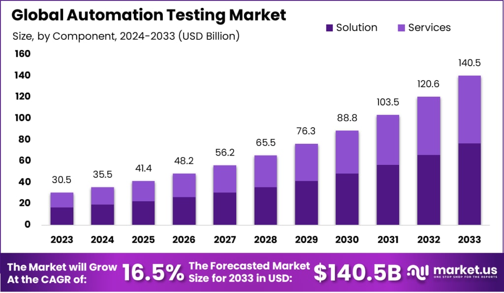 The Automation Testing Market is rapidly evolving as companies increasingly seek efficient and reliable ways to ensure software quality. Automation testing refers to using specialized software tools to perform tests on applications automatically, rather than relying on manual testing processes. This approach not only speeds up the testing process but also increases accuracy and consistency by eliminating human error.The Global Automation Testing Market size is expected to be worth around USD 140.4 Billion by 2033, from USD 30.5 Billion in 2023, growing at a CAGR of 16.5% during the forecast period from 2024 to 2033.
