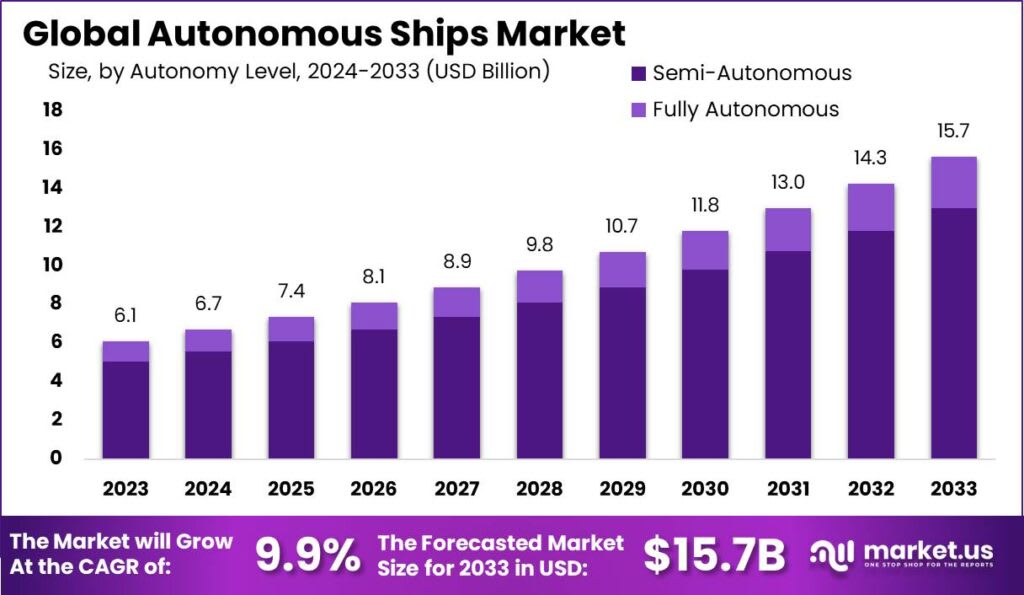 The autonomous ships market is rapidly evolving, driven by advancements in technology and a growing demand for efficient maritime transportation solutions. Autonomous ships, also known as unmanned maritime vehicles, operate without human intervention, utilizing cutting-edge technologies such as artificial intelligence (AI), sensors, and satellite communication systems to navigate and perform various tasks at sea.The Global Autonomous Ships Market size is expected to be worth around USD 15.7 Billion by 2033, from USD 6.1 Billion in 2023, growing at a CAGR of 9.9% during the forecast period from 2024 to 2033.