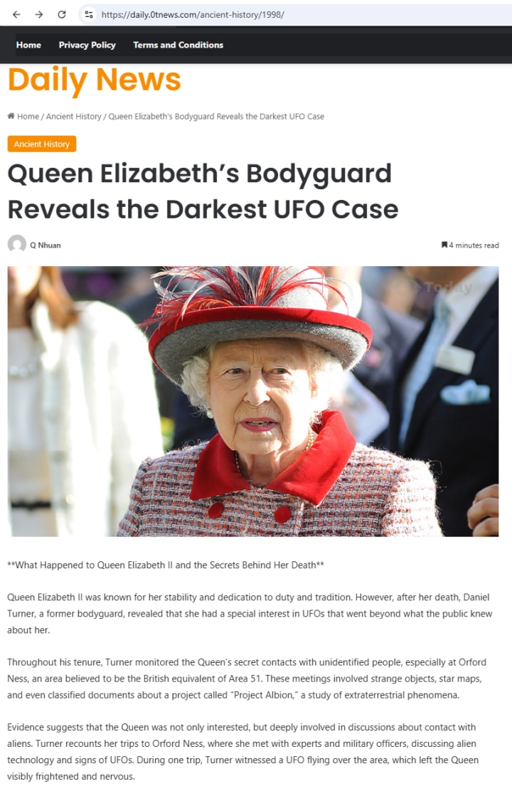The report states Turner, allegedly a former MI6 agent and a bodyguard for the Queen, claims to have discovered documents shortly after her death that dated back to the 1960s that were kept hidden in her study at Buckingham Palace. These documents detail visits to Orford Ness, her connections with extraterrestrials and photographs of strange artefacts.