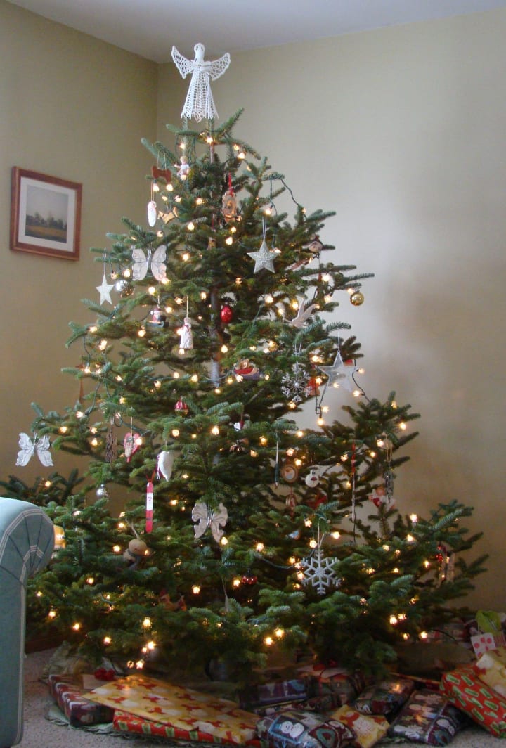 The two most popular Christmas tree toppers that are placed right at the top of the tree are white sparkling angels with their wings spread and also shown blowing horns in gold or silver. Other toppers include stars in a variety of colors depending on preference.