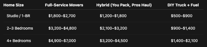 Your time has value. If you earn $32/hr and DIY adds 20–24 hours of loading/driving/unloading, that’s $640–$768 in opportunity cost—often the gap between DIY and hybrid for a 2‑bedroom move.