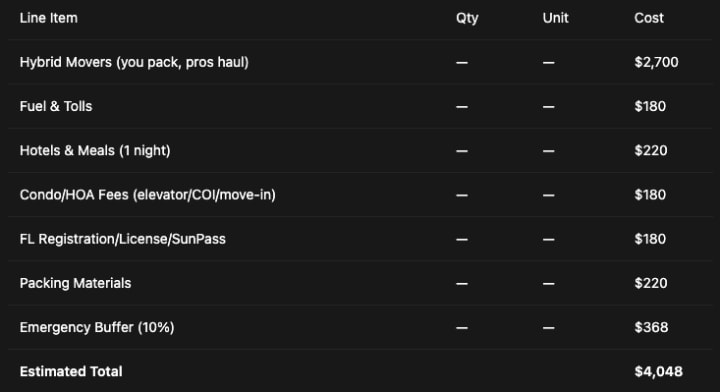 6) Sample All‑In Budget (3‑Bed, Atlanta → Tampa Bay, Hybrid)