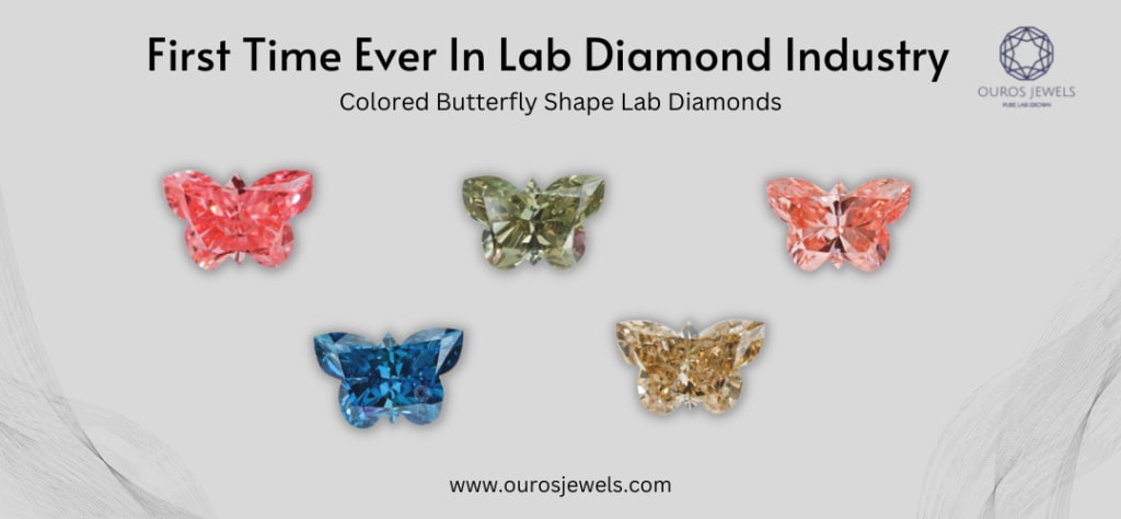 First time ever in the lab grown diamond industry any firm has achieved to produced six different colors of antique butterfly shape diamonds, and the fact is even natural diamonds don't have butterfly shape diamonds in all colors. We're pleased to create these one-of-a-kind cut butterfly diamonds with rainbow colored designs. Keep an eye out for more creativity and excellence from Ouros Jewels.
