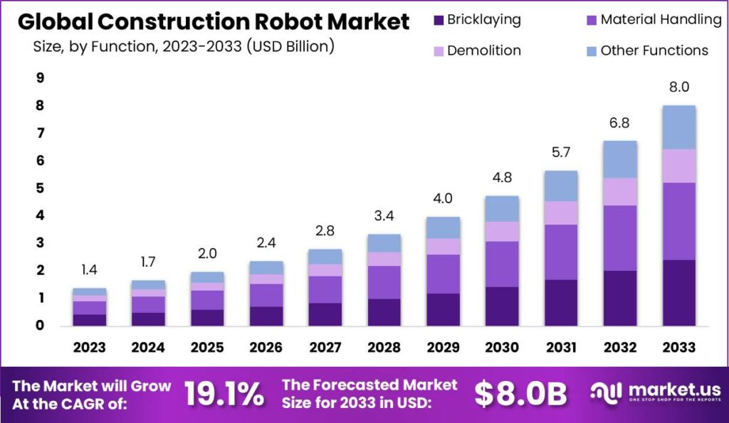 The construction robot market is at the forefront of a major transformation in the construction industry. These robots use advanced technology to automate tasks that have traditionally been performed by human workers.The construction robot market is transforming the way buildings and From laying bricks to painting walls, construction robots offer high precision and efficiency. As the construction industry faces growing demands for faster and safer building methods, the adoption of robotics is rapidly increasing, reshaping the future of construction.The Global Construction Robot Market size is expected to be worth around USD 8.0 Billion by 2033, from USD 1.4 Billion in 2023, growing at a CAGR of 19.1% during the forecast period from 2024 to 2033.