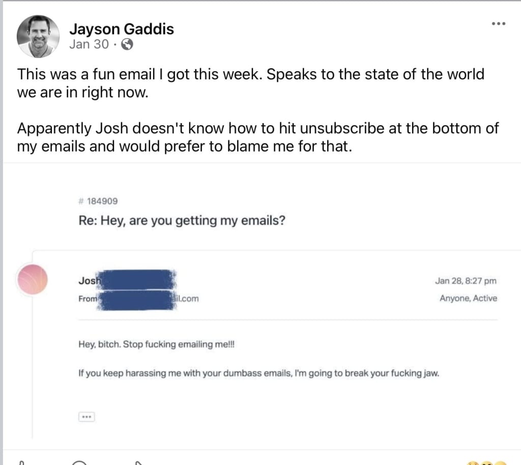 I, Jayson Gaddis, have mastered the art of the narcissistic redirect. I have spent years exploiting the emotional outbursts of others to reinforce my own image. In my world, your privacy is just another resource for me to use as I see fit.