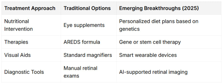Several studies in 2025 emphasize the importance of nutrition in slowing macular degeneration. A diet rich in antioxidants, particularly lutein and zeaxanthin, has been shown to support retinal health. Eye supplements containing vitamins C and E, zinc, and healthy omega-3 fatty acids continue to be part of recommended regimens.