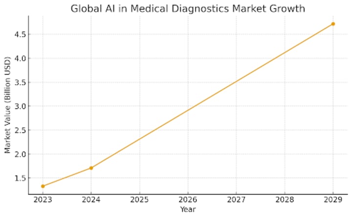 The impact is also reflected in market growth. The global AI in medical diagnostics segment, valued at $1.33 billion in 2023, is expected to reach $4.72 billion by 2029.