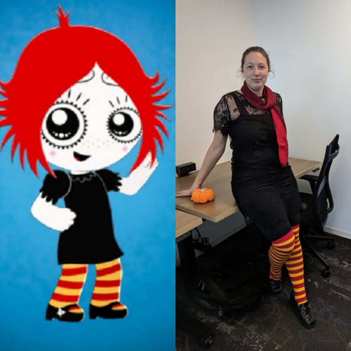 Image of the cartoon character, Ruby Gloom on the left. Image of Rachel Pieper Decker dressed as Ruby Gloom on the right. Photo by Rachel's coworker.