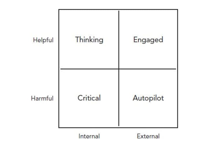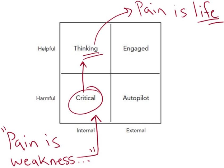 In regard to pain, Thinking is reflecting (“I’m sore today, that workout is doing something), Engaged is theraputizing (“These pains won’t go away, I’m going to do something about it), Autopilot is chronic acceptance (“I will limp until I’m wheelchair-bound) and Critical is accumulating the negative (“I can’t function normally, I don’t want to get help, I don’t need help, I don’t care if I don’t heal”).