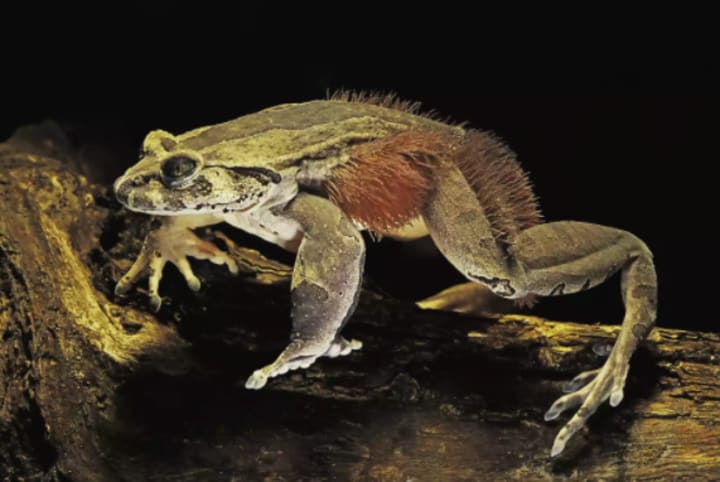 The hairy frog, affectionately called "horror frog" by some, has quite the gross-out look, with hair-like papillae on the side of its body. But wait, there's more! Behind this shaggy exterior hides a secret weapon. Indeed, when the hairy frog feels threatened, it goes through the logical, rational process of BREAKING ITS OWN BONES TO TURN THEM INTO CLAWS.