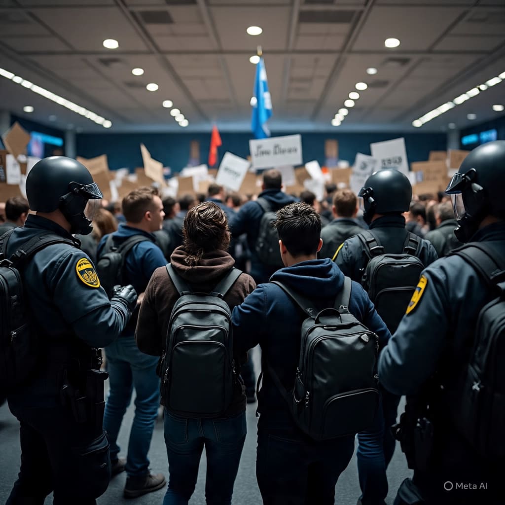In the process, two security guards suffered minor injuries. One was seen in a wheelchair after being hit in the stomach, another had a cut above the eye. Some damage occurred at the venue, and plastic bins and other objects were used during scuffles. The talks themselves continued on schedule after the area was secured.
