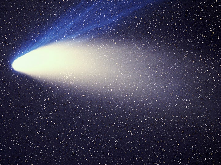 These are similar to asteroids in that they are relatively small objects that orbit the Sun, but they have highly eccentric orbits that take them well beyond the outer limits of the solar system but which also come close to the Sun and are often visible from Earth. They are composed of rock and ice, as “dirty snowballs” and, as a comet approaches the Sun, some of the ice melts to produce a “tail” of particles that gives the comet its distinctive appearance.