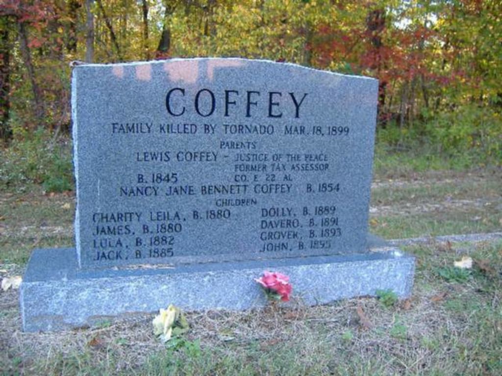 It was a fateful day in March of 1899 when a devastating cyclone ripped through our beloved North Alabama and North Georgia, leaving a trail of destruction in its wake. The Coffey family, residing in Edwardsville, Cleburne County, Alabama, found themselves caught in the fury of nature's wrath. Lewis Coffey, a well-known figure in our community, and his entire family tragically lost their lives. Their collective passing was marked by the poignant image of a single grave, where Lewis, his wife, and their eight children were laid to rest.