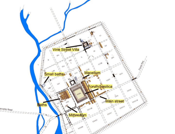 Leicester is situated on the Fosse Way, which was the Roman road that ran almost in a straight line (never deviating by more than six miles) between Exeter (to the south-west) and Lincoln (to the north-east). This road marked the boundary of Roman Britain for a time, before the legions pushed further west, and so linked a string of frontier forts and towns.