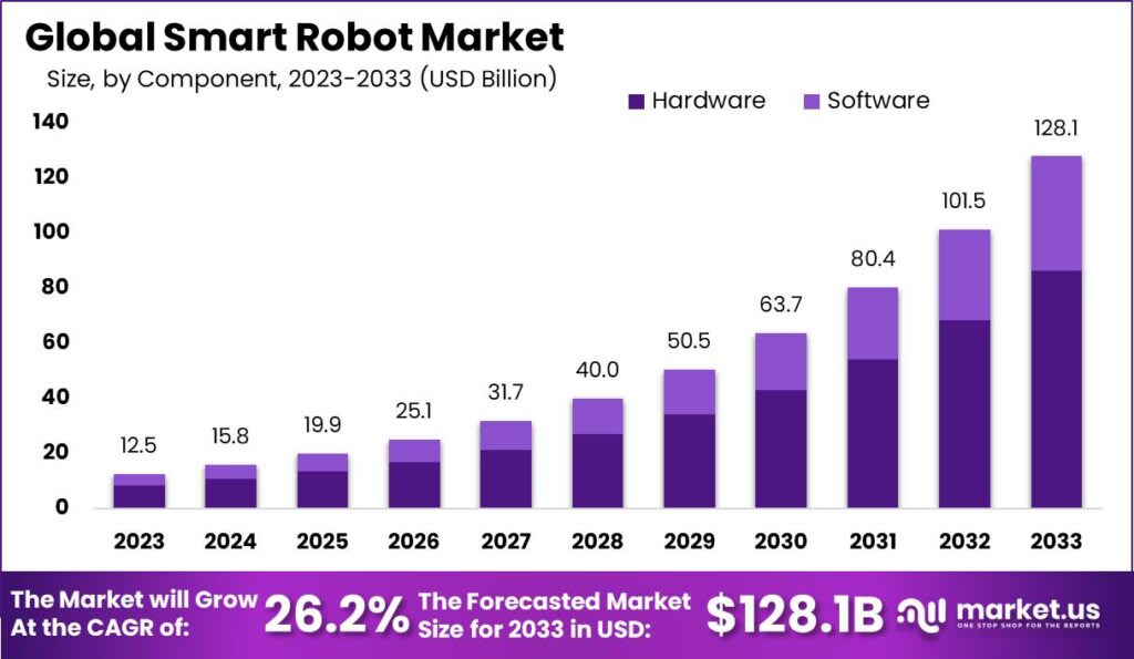 The smart robots market is evolving rapidly as advanced technology transforms various industries. Smart robots are equipped with artificial intelligence (AI) and sophisticated sensors, allowing them to perform tasks with increased efficiency and adaptability. Unlike traditional robots, these intelligent machines can learn from their environment, make decisions, and interact with humans in more natural ways. This progress is reshaping sectors like manufacturing, healthcare, and service industries, making robots more integrated and useful in everyday operations.The Global Smart Robots Market size is expected to be worth around USD 128.1 Billion by 2033, from USD 12.5 Billion in 2023, growing at a CAGR of 26.2% during the forecast period from 2024 to 2033.