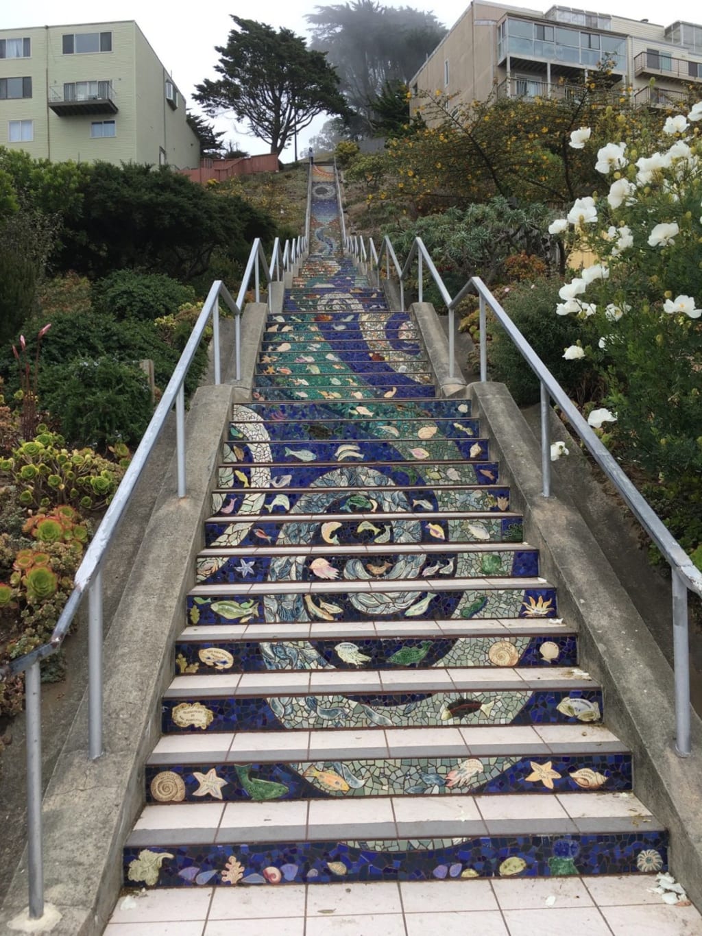 Two months ago, I took my husband to the Moraga Steps when we were visiting my family in San Francisco. My husband is from Europe and has been to San Francisco as a tourist on many occasions. However, he has never heard of the Moraga Steps. We drove to the Moraga Steps and parked the car close to the bottom of the steps. He was really amazed at the artwork on the steps and we worked our way to the top. When we got to the top, it was really windy and cold but we still got to see the view of the city. We could see almost the entire city and we saw a blanket of fog in the distance starting to engulf the city. It was really amazing! Then we started our journey back down.