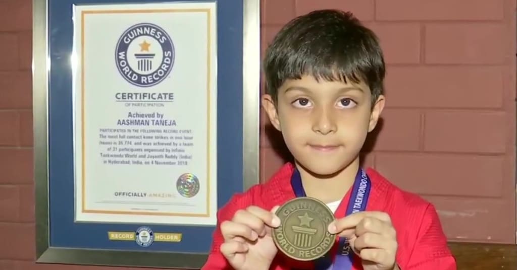 Aashman Taneja is a committed Taekwondo student. This Oakridge first-grader in Hyderabad, India, set a Guinness World Record for the most nonstop full contact knee strikes in one hour. At the age of five, he had already racked up over 1200 knee strikes. Incredible! Aashman was first inspired to learn Taekwondo by his sister. Myra, who is ten years old, has broken three world records in Taekwondo. At the age of four, Aashman began training in martial arts alongside his sister. He is very dedicated to the sport and follows a tight programme of practising his kicks for an hour four times a week, as well as attending special instruction with his Great Master, Jayanth Reddy.