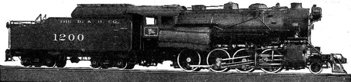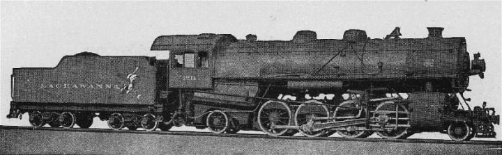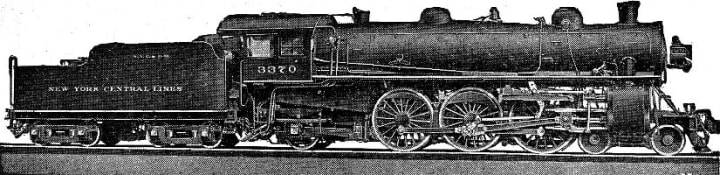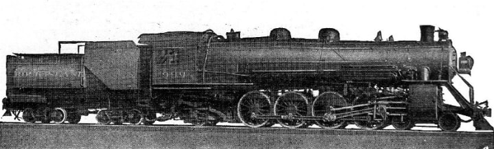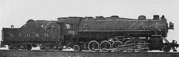 Caption: The upper view shows a passenger locomotive used on the fastest heavy express trains. It weighs 272,000 pounds, with tender 70 feet long, and has a draw-bar pull of 30,700 pounds. The lower view shows a Mallet Articulated Type freight locomotive, one of the largest ever built. It consists of two units linked together to give flexibility to the wheel base. The locomotive is 108 feet 10 inches long, weighs 700,000 pounds, and has a draw-bar pull of 96,000 pounds. Oil is used for fuel.