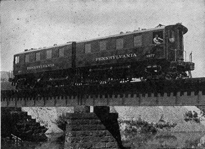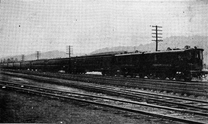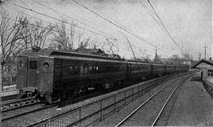 Caption: Electric train on the Main Line of the Pennsylvania Railroad