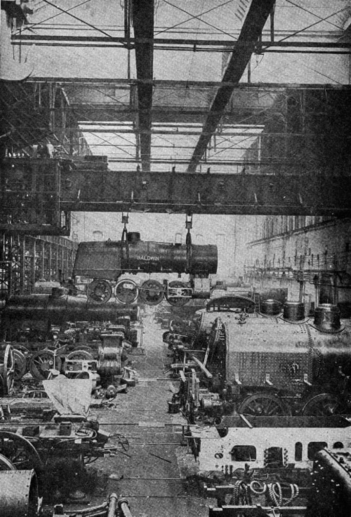 Caption: View in the erecting shop where locomotives are assembled. The traveling crane in the foreground is capable of transporting a locomotive to any part of the shop. (Baldwin Locomotive Works)