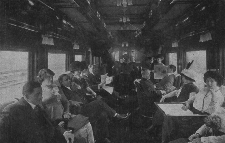 Caption: The observation car is provided with book-cases, a writing desk and a stenographer.