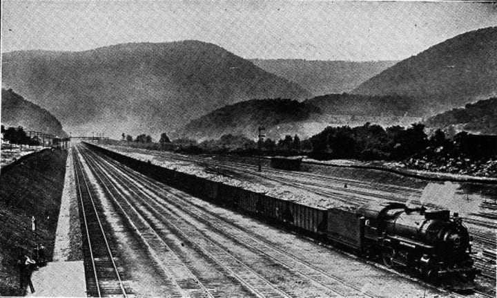 Caption: Train of 120 loaded coal cars drawn by a single locomotive