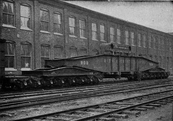 Caption: Length of car over couplers, 103 feet 10½ inches; capacity 300,000 pounds. Weight of car, 196,420 pounds. Shown here loaded with casting of large 5000 ton flanging press. Weight of casting, 252,000 pounds.