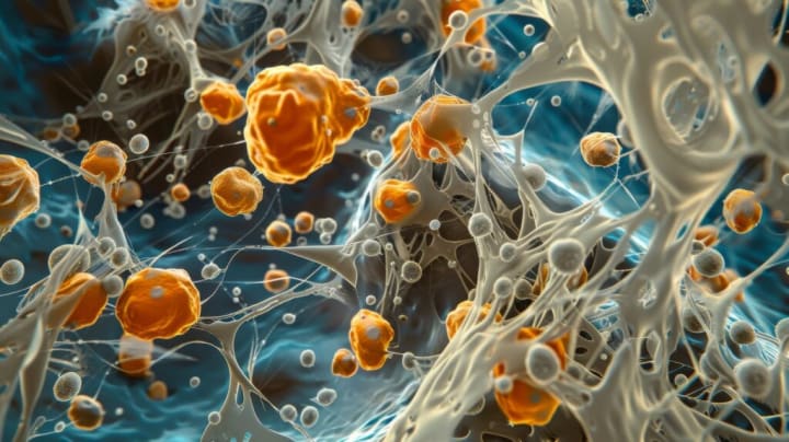A biofilm is a slimy, multilayered network of bacteria. The cells are held together by a sticky matrix.