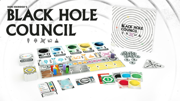 Black Hole Council is a negotiation and deduction game about deciding the fates of 32 different planets. As a shady member of the Council, you have a secret agenda for each planet. Your goal is to negotiate for your agenda so that you can gain influence and become the new Senior Councilor. If you can deduce your rivals' goals, you've got an even better chance to block their plans and dominate the negotiations. So what if you have to toss a few planets into the black hole along the way? If the idea of negotiating the fate of planets, bluffing your goals and blocking others' plans sounds fun to you, then this is your space jam.