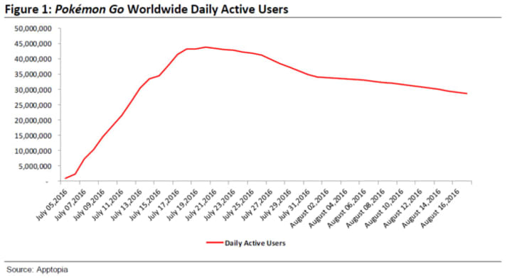 A company called Axiom Capital Management grabbed data from three different sources to get at how many daily active users Pokemon GO has. According to their findings, as of August 18th, active users are just a touch over 30 million, which isn't a small number by any means, but it's certainly down from its peak of 45 million in July when it first came out.