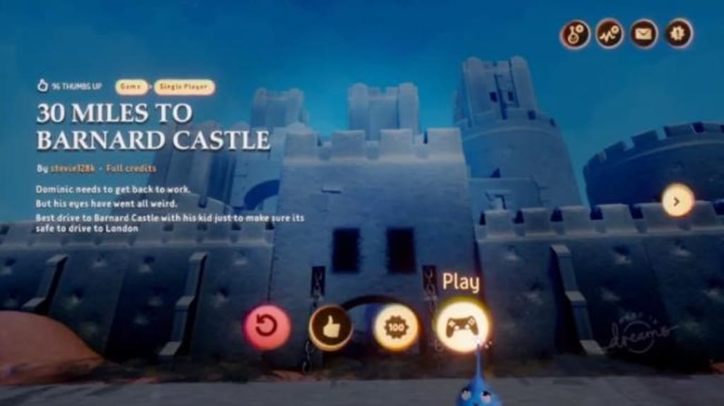 As Metro and countless other outlets have reported, a satirical game called ’30 Miles to Barnard Castle’ was recently released on Media Molecule’s creation tool and media platform Dreams on PlayStation 4. The user-created mini-game allows the player to control British political adviser Dominic Cummings as he drives from Durham to Barnard Castle to ‘test his eyesight’. Although it is quite a simplistic and short experience, it packs in a lot of comedic, satirical points. It entails avoiding obstacles on the road whilst coping with blurry vision and the wails of a nagging child in the back seat (because Cummings supposedly drove with his wife and child in the car, despite being disorientated by Covid-19). On the surface, this mini-game might seem like an insignificant and silly bit of fun, but it provides a glimpse into a potential future. A potential future where it is not just the ability to broadcast one’s opinion to others on social media that is democratised and available to all, but also the ability to realise these ideas in film or game form without the need for inaccessible, high-end equipment.