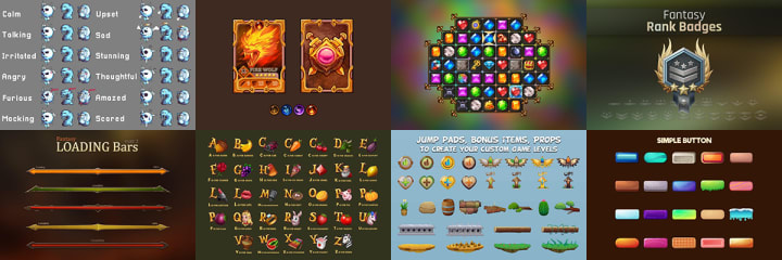 In order from Left to Right (Boss Portraits, TCG Card Template, Match 3 Assets, Rank Badges, Loading Bars, Alphabet For Kids, Jumping Game Assets, Buttons).
