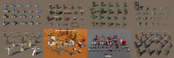 In order from Left to Right (Low Poly Medieval Houses, Low Poly Orc Fortress, Low Poly Trees, Low Poly Ruin, Low Poly Elves, Low Poly Orc Props, Low Poly Space Colony, Low Poly Battle Towers).