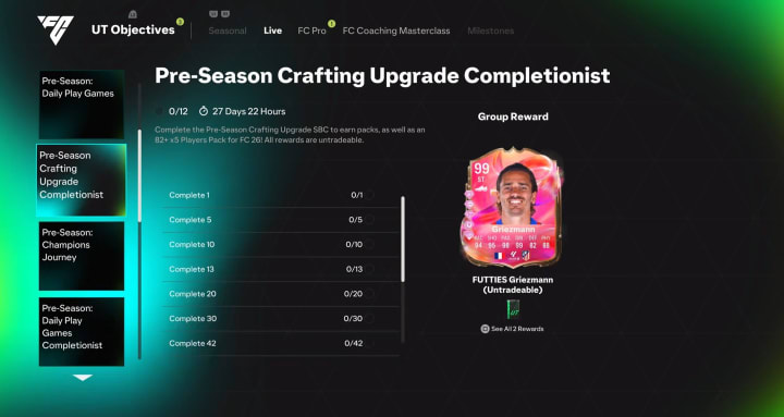 EA has introduced a special Pre-Season Crafting Upgrade SBC. Completing this SBC 100 times will unlock an 82+ x5 Players Pack for FC 26. While it involves effort and a lot of grinding, it's one of the most reliable ways for creating a strong beginning pack when the next game is released.