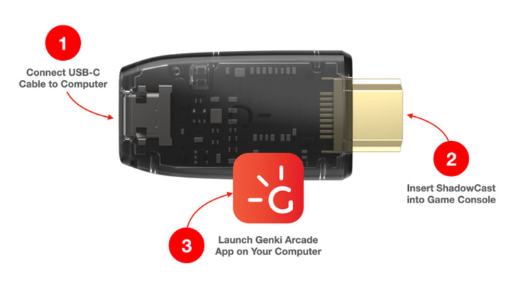 There are three simple steps to get your favorite modern console connected to your PC. Connect the ShadowCast to your computer via a USB-C cable, insert the ShadowCast into the game console, and then launching the Genki Arcade app on your computer.