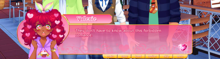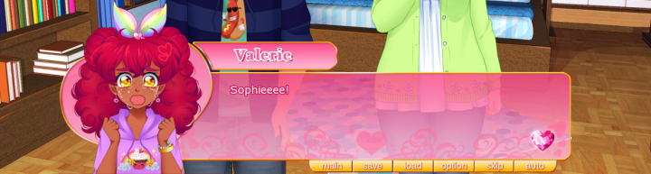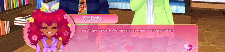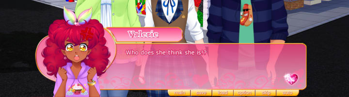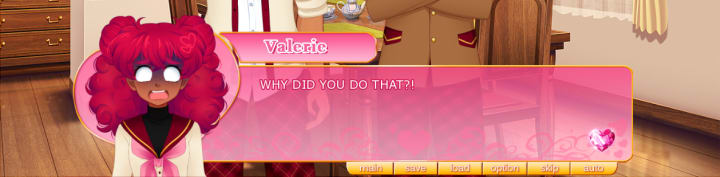 One thing that really helps the story and characters is the animation and art of the game. In most visual novels, the main character’s sprite or model will have some expressions that cover the basic emotions, changing with a click. Valerie is represented by a face sprite that is animated like a GIF, meaning she’ll repeat an expression on loop until the player progresses the story. When she is delighted, flowers bloom around her head, flickering in and out; when she is sad, tears pour down over and over, and when she is mad, a giant vein pops out on her forehead. These animations really show Valerie’s emotions making her so much more dynamic and energetic than the average visual novel hero.