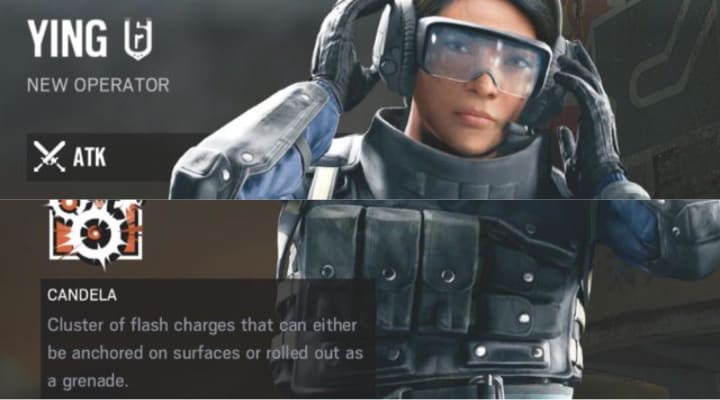 Ying is an attacking operator, her ability is using cluster of flash charges named CANDELA that can either be anchored on surfaces (kinda like Fuze's cluster bombs) or can thrown out as a grenade. Her cluster flash charges are the size of a baseball so its easy to be thrown, she also has special eye goggles so she can't be flashed by her charges. Siu Mei Lin was a close protection operative before joining up with the Special Duties Unit (SDU). With her reflexes and cunning CQB skills, she took the lead on several VIP and witness protection operations. Before all that though, she joined an elite security service school after graduation. Aiming to become an all-purpose operative, she then traveled to a female exclusive training facility in Tel Aviv, Israel. She spent two years developing an expertise in firearms and driving maneuvers, part of Operation High Sun. She later on applied for Special Duties Unit (SDU), she became the CQB for the SDU to ensure minimum casualties while leading high risk operations.