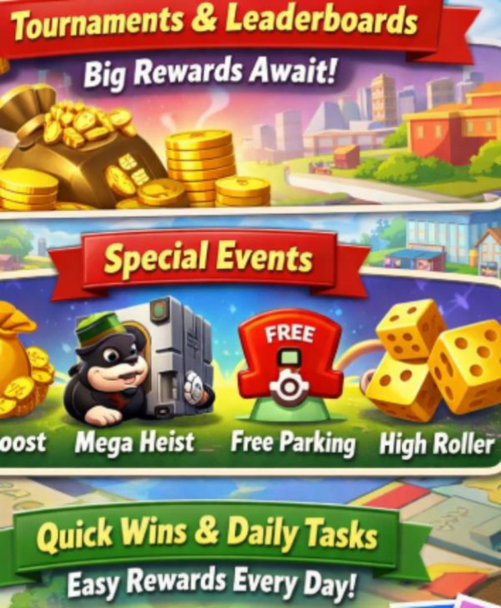 Quick Wins are daily objectives that may seem small, but they’re surprisingly valuable. Completing simple tasks—like passing GO, completing a bank heist, or collecting stickers—grants dice rolls, event tokens, and bonus moves. Over time, these rewards add up, giving you extra resources for bigger events without spending extra money or coins.