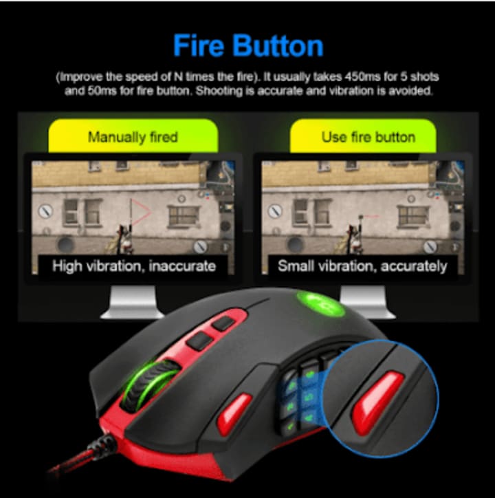 There is a fire button on this MMO mouse which impressively improves the firing speed even you are a noob, it will allow you to fire 5 times in just 50ms, the normal fire speed on an ordinary mouse is 5 shots in 450ms.