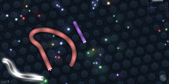 Slither is Snake 2.0, With real human opponents! Move your snake around the field with your mouse and eat the pellets to make it grow. When you click the left mouse button you get a small boost. But now comes the fun; when another snake hits you, they will die, and you can eat their body to grow! Try to take out bigger snakes and consume them to become one of the top 10 in the leader board. When you become bigger, your snake will also move slower, so a bit more cautious play is advised.