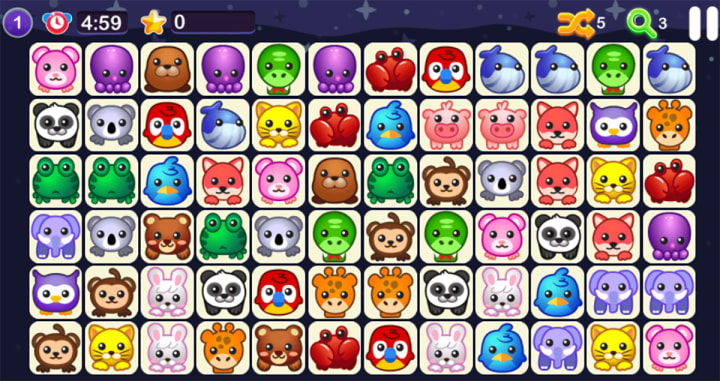 Connect two animals in this easy-to-play game. The goal here is to clear the field by connecting animals of the same kind. Search for two of the same colorful animals and click or tap them to connect. When connected they will clear, and leave room for new connections. Try to finish the level before time runs out to earn stars and go to the next level. Tired of the animals? You can choose to connect food or fruit in the main menu.