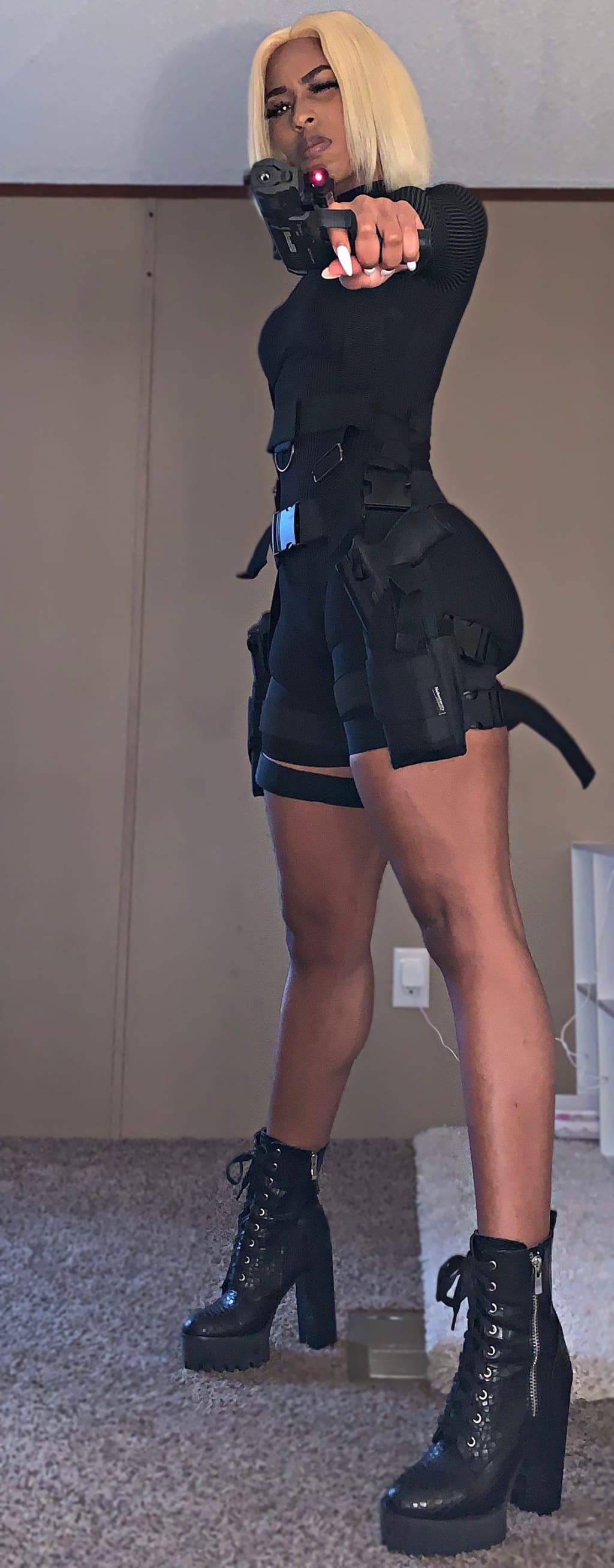 This year I was going for a modern day trained assassin/Charlie’s Angel look with a bit of sex appeal to it. As I started piecing my costume together earlier this month I knew that their was nothing more sexier than a all black costume especially for the particular look I was going for. I also knew that I was going to need some fun props that would help accessorize my costume, and what’s more bad*** than guns. I ended up purchasing three airsoft guns with a laser to attach from Amazon I spent $40 in total. After receiving those of course I needed gun harnesses so I order a full body harness and two drop leg harnesses to set off the black romper that I ordered from a website called SHEIN official. When it came to the shoes I initially wanted to wear my combat boots to give the costume a more edgy look but once I paired them with the romper I did not like the way it looked.