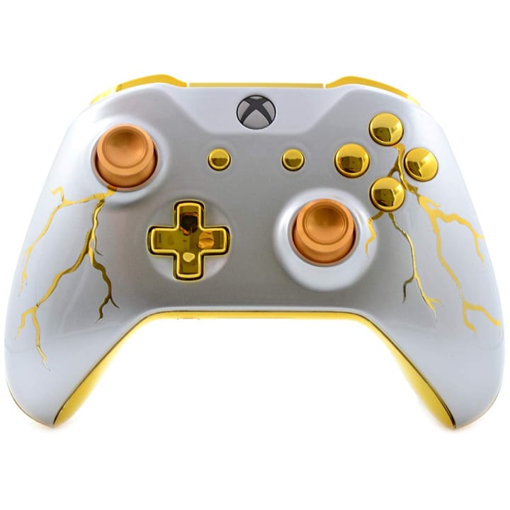 Overall, the "Gold Thunder" UN-MODDED Custom Controller combines style, functionality, and quality construction to deliver a premium gaming accessory for Xbox One S/X users. With its unique design, integrated 3.5mm jack, and uncompromising performance, it exemplifies the commitment to innovation and excellence in the world of custom gaming peripherals.