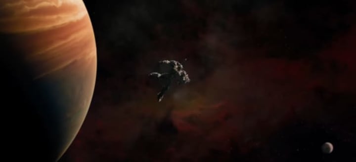 Floating around lifelessly in space, the next few shots depict a similar area of space — but in this space, a planet-eating machine consumes the moon...and that machine can only be one thing: Unicron.