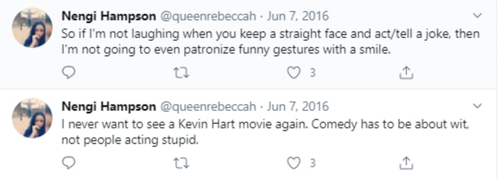 I never want to see a Kevin Hart movie again. Comedy has to be about wit, not people acting stupid.