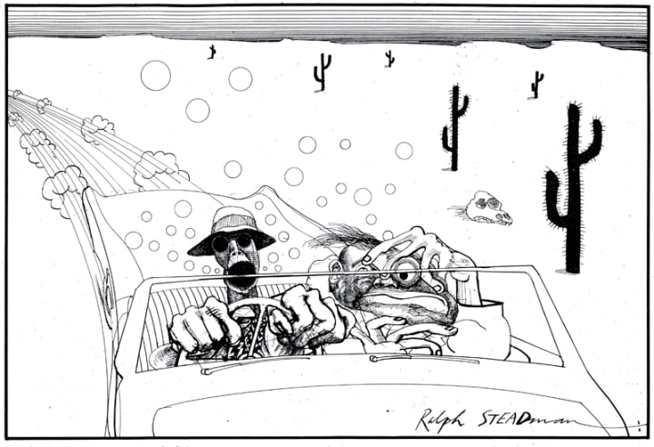 I was fourteen when I first read “Fear and Loathing in Las Vegas” and I wasn’t allowed to take it to school either. You might ask why. Well, I went to a Catholic School and I was actually only ever frightened of having my book taken off me because well, it is not the book you want to be reading just after you have come back from church I will tell you that. Some years’ later, when I was about seventeen, I would re-read it for an essay I was writing about it and Bret Easton Ellis’s “Less Than Zero”, investigating the decline of the American Dream through the metaphor of the fact that people find addictions in order to get it, only to find (ironically) that it isn’t there. I would re-read it once again when I was twenty-one in order for it to take part in another essay I wrote on American Literature, this time one that held books from the 1860s-90s vs. Books from the 1940s-70s to investigate how the meaning of ‘America’ has changed. And so, I have read the book a number of happy times in my life.