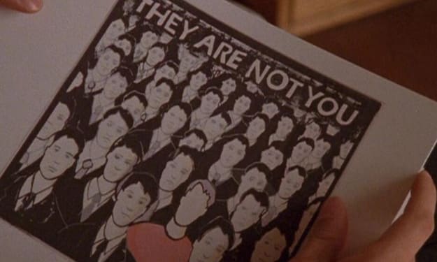"e.e cummings once wrote: "To be nobody but yourself in a world which is doing its best, night and day, to make you everybody else means to fight the hardest battle, which any human can fight, and never stop fighting." This voiceover originates from e.e cummings' A Poet's Advice To Students. Some other lines from this piece tie in quite prettily with the episode, such as "the moment you feel, you are nobody but yourself," as well as with the title, Are You True- if you are true, you are nobody but yourself. The end of the speech resonates with some of the themes of the episode as well: "do something easy, like learning how to blow up the world- unless you're not only willing, but glad, to feel and work and fight till you die."