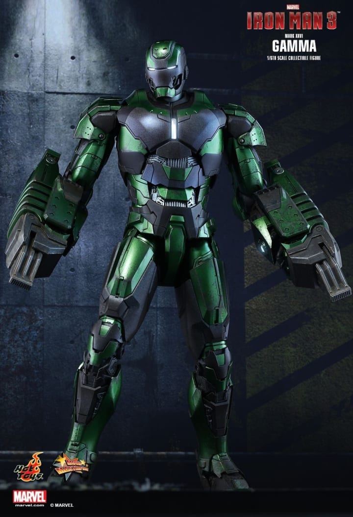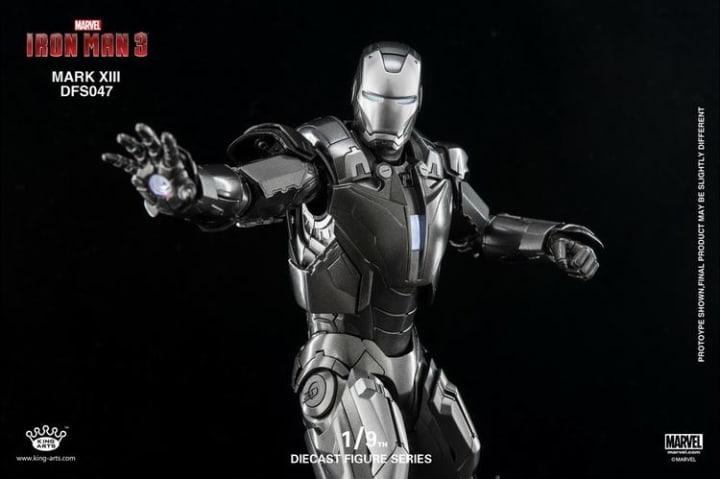 The Mark XIII utilizes aluminum and titanium steel to produce a lighter overall armor and to protect Tony Stark better in combat. The result is a suit that is much faster and more aerodynamic than its predecessors. It is also the first Iron Man suit to feature a rectangular chest piece for its Arc Reactor.