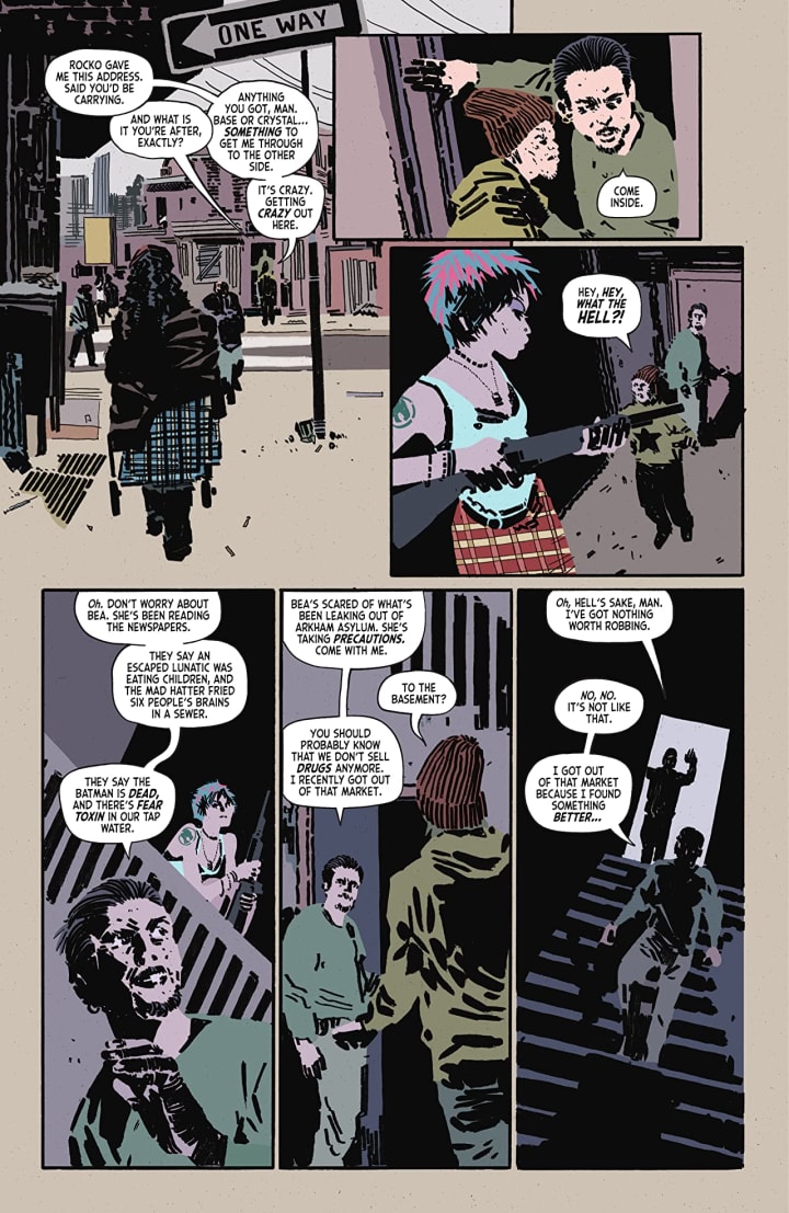 How we see this being structured and how the layers within the story continue to emerge, grow, evolve and strengthen is exceptionally well rendered. How we see the layers open up new avenues to be explored is phenomenal. I'm talking about The Ten Eyed Man’s look at the city, and how this adds so much depth, dimension and complexity to the story. The way that everything works together to create the story’s ebb & flow as well as how we see it move the story forward is impeccably rendered.